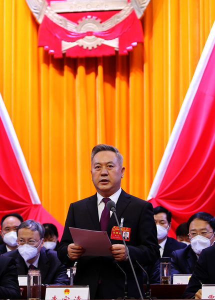 新当选的市人大常委会主任李宝清发表讲话。 记者弓华静 摄