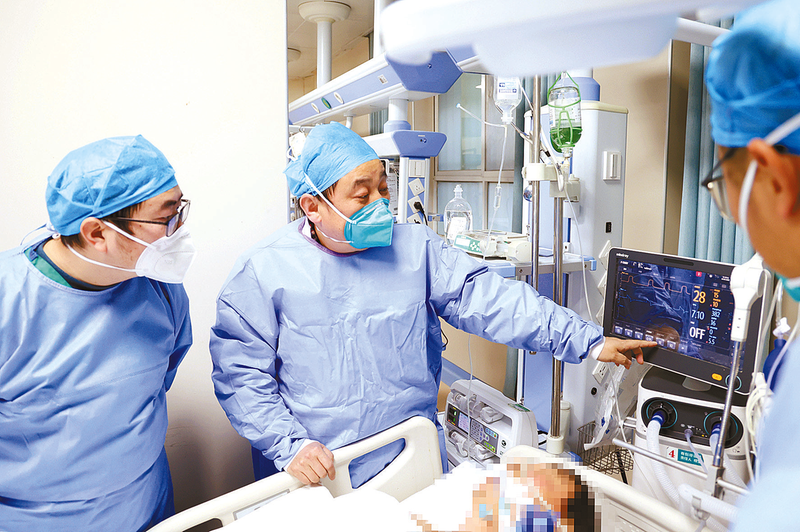 近日,市中心医院呼吸重症医学科医疗团队在病房进行检查探视,了解患者情况。