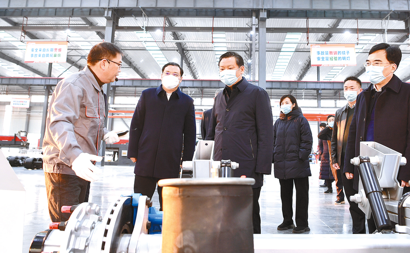 市委书记鲍常勇率队在已投产的驿城区奥通机械产业园了解企业生产情况。