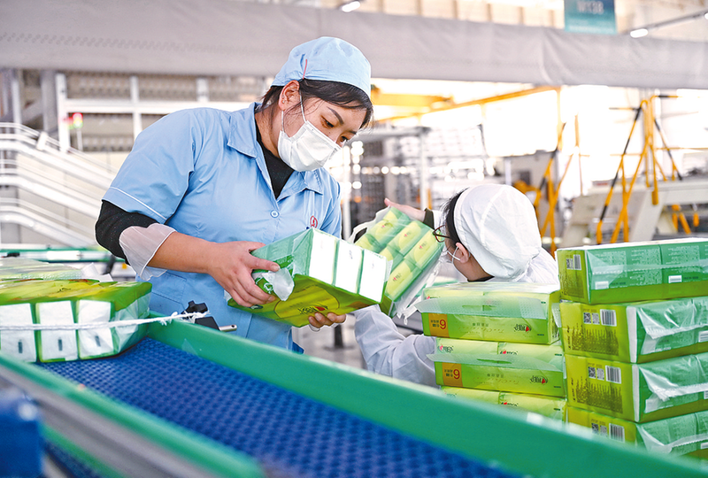 2月2日,在位于泉州市晋江市的恒安集团,员工在包装流水线上检验产品。新春伊始,福建省泉州市多家民营企业开足马力抓生产,以期保证首季“开门红”。 新华社记者 林善传 摄