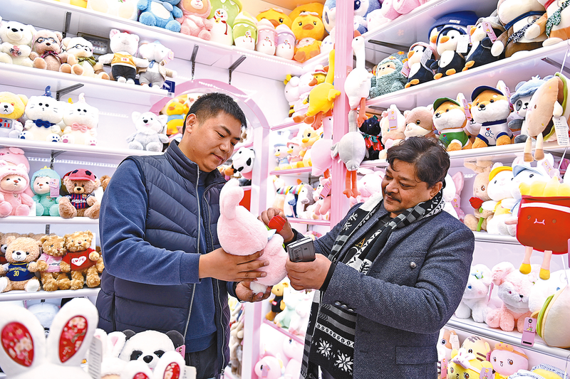 2月2日,来自印度的客商拉贾(右)在义乌国际商贸城的一家玩具店铺内选购。当日,全球最大的小商品批发市场——义乌国际商贸城迎来兔年开市。 新华社记者 黄宗治摄