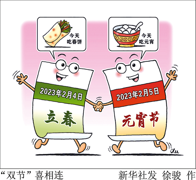 2月4日和2月5日将分别迎来立春节气和正月十五元宵节,这两个节令紧相连,可谓喜上加喜。据了解,这种有趣的巧合,在21世纪这100年中仅有6次。 新华社发 徐 骏 作