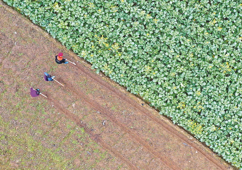 2月9日,村民在贵州省黔东南苗族侗族自治州岑巩县大有镇异溪村地里劳作(无人机照片)。