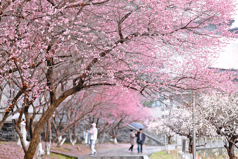 2月11日,在湖南省湘西土家族苗族自治州吉首大学,市民在梅园里赏梅。早春时节,各地春花开放、生机勃勃。