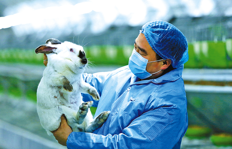 2月15日,位于驿城区古城街道大马园村的华兴农牧发展有限公司养殖场内,工作人员正在检查肉兔生长情况。