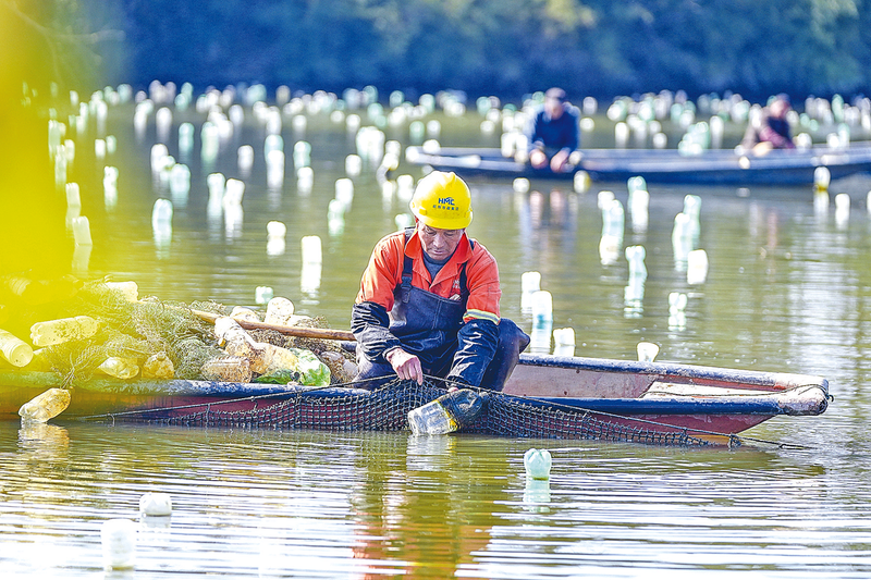 近年来,浙江省长兴县利用当地丰富水资源优势,科学引导村民进行淡水珍珠养殖。最近,养殖户们抢抓农时开展河蚌育珠春管作业,河塘里一派忙碌景象。 新华社发