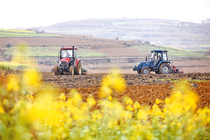 2月22日,在贵州省黔西市林泉镇清浦村,农民驾驶拖拉机翻耕土地。