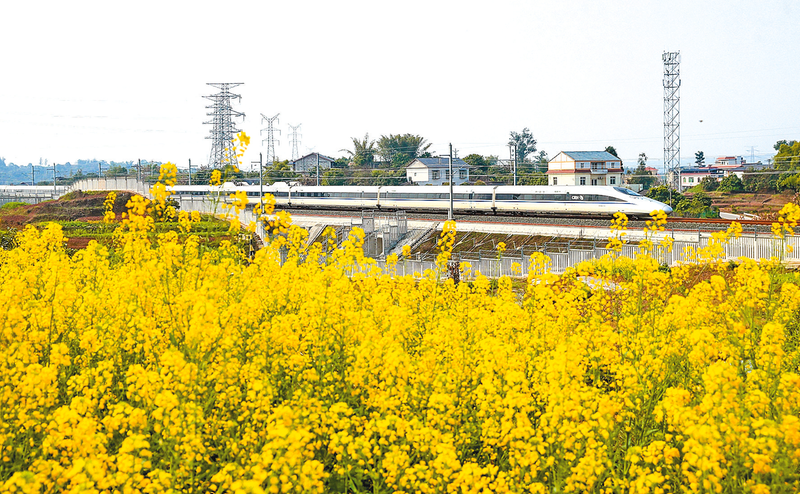 春暖花开时节,油菜花陆续盛开,列车穿行其间,美不胜收。