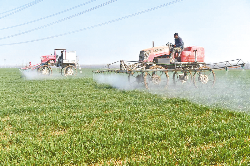 2月27日上午,笔者在位于上蔡县高标准农田示范区的吴宋湖农场看到,工人正驾驶“高腿”弥雾机开展“一喷三防”作业。