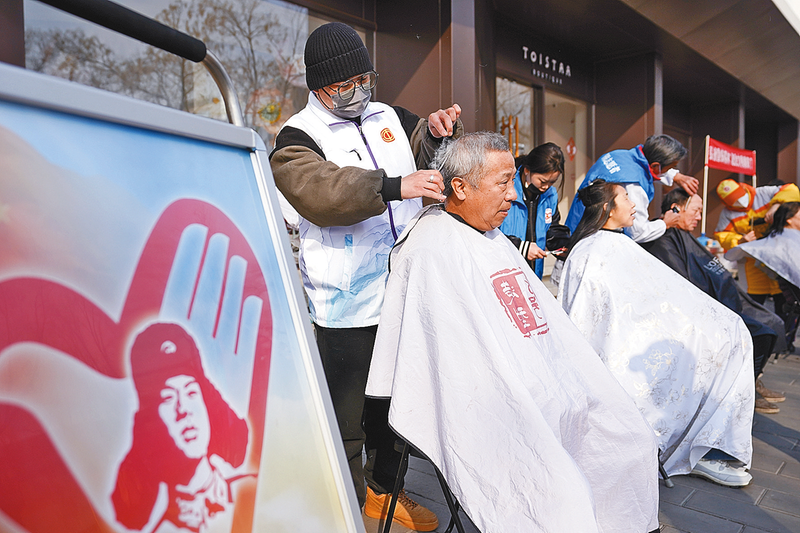 3月4日,在北京市东城区朝阳门街道,志愿者为居民免费理发。