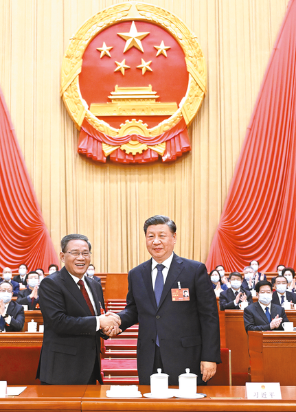 3月11日,十四届全国人大一次会议在北京人民大会堂举行第四次全体会议,根据国家主席习近平的提名,经过投票表决,决定李强为中华人民共和国国务院总理。这是习近平同李强握手。 新华社记者 李学仁 摄 新华社北京3月11日电 十四届全国人大一次会议11日上午在北京人民大会堂举行第四次全体会议,根据国家主席习近平的提名,经过投票表决,决定李强为中华人民共和国国务院总理。国家主席习近平签署第一号主席令,根据大会决定,任命李强为国务院总理。