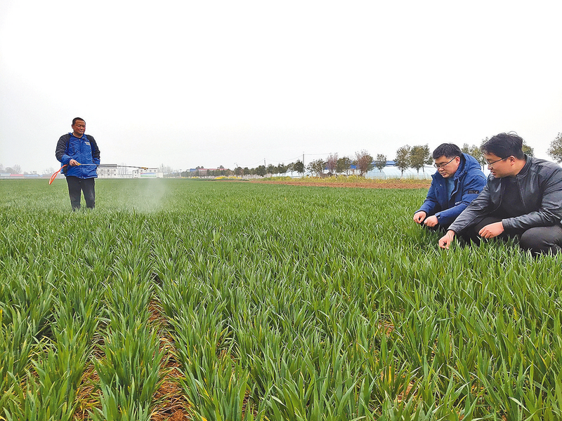 时下,小麦已进入拔节孕穗期,泌阳县泰山庙镇王庄村紧紧围绕夯基稳粮目标,有序开展春耕保障各项工作。图为农技专家深入田间地头,指导群众做好小麦田间管理。 记者 方 祥 摄