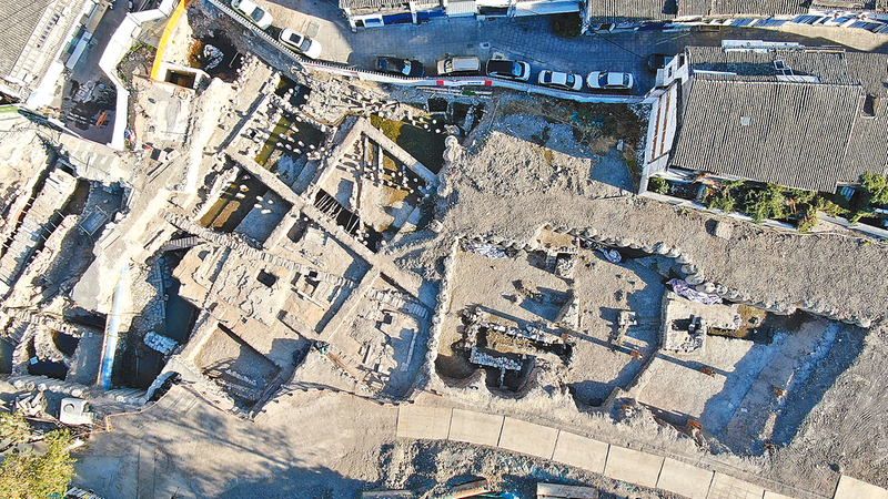 俯瞰浙江温州朔门古港遗址发掘出的古码头遗址(2022年10月10日摄,无人机照片)。 新华社记者 翁忻旸 摄