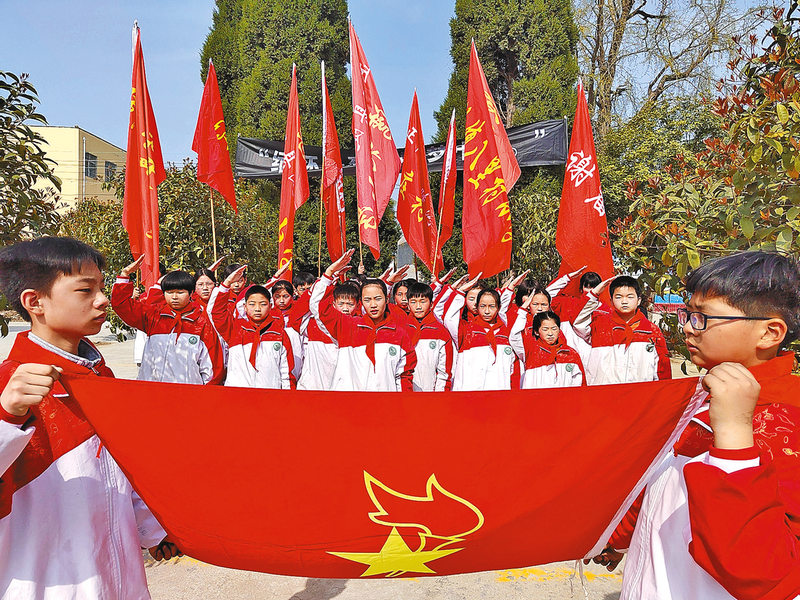 4月2日,正阳县陡沟镇中心校组织中小学生为田奉先烈士扫墓。清明 节来临之际,当地开展“缅怀革命先烈,传承红色基因”等形式的主题教育活动,对学生进行爱国主义教育。 通讯员 贺永明 摄