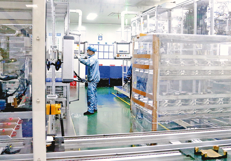 近日,在河南省鹏辉电源有限公司生产车间,工人正操控设备生产新产品。