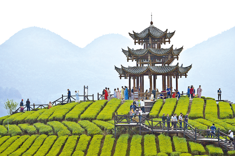 4月21日,游客在宣恩县伍家台村茶园游览。