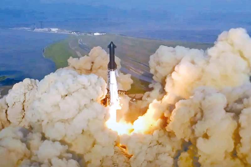 这张4月20日由美国太空探索技术公司提供的视频截取的图片显示,新一代重型运载火箭“星舟”以及飞船集成系统在位于得克萨斯州博卡奇卡的发射基地升空。