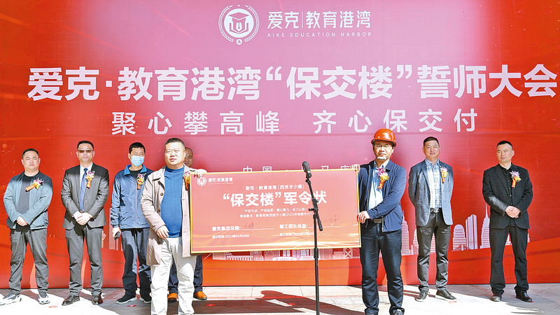 4月 26 日,爱克·教育港湾举行“保交楼”誓师大会,爱克集团总裁王峰、河南省爱克实业发展有限公司总经理任永强、驻马店开发区嘉富诚置业有限公司总经理张震、爱克·教育港湾项目工程总经理杨小坤等出席了誓师大会。