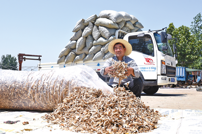 5月16日,在正阳县熊寨镇毛集村长丰食用菌种植农民专业合作,理事长刘长见正在翻晒蘑菇干。近年来,该村拓宽销售渠道,不但销售新鲜蘑菇,而且把蘑菇晒成干销往国外。