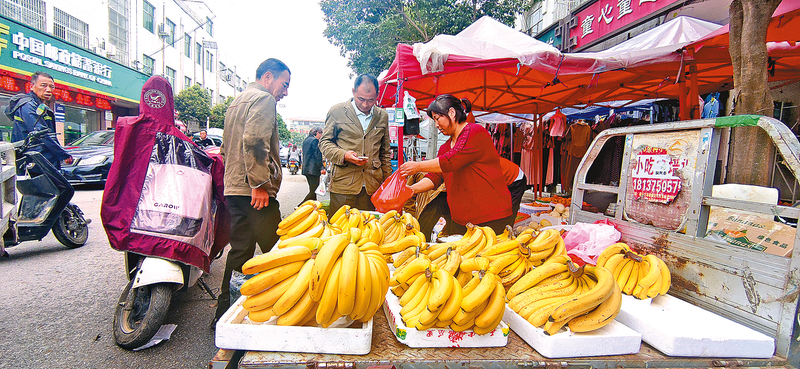 在一处水果摊前,摊主热情地介绍着各种水果,麻利地为顾客递袋、称重。“今天天气不错,又逢集,赶集的人也多,生意不错。”摊主笑着说。