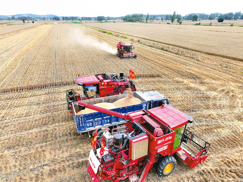 6月2日,在河南省驻马店市确山县双河镇,农机手操作联合收割机收获小麦(无人机照片)。