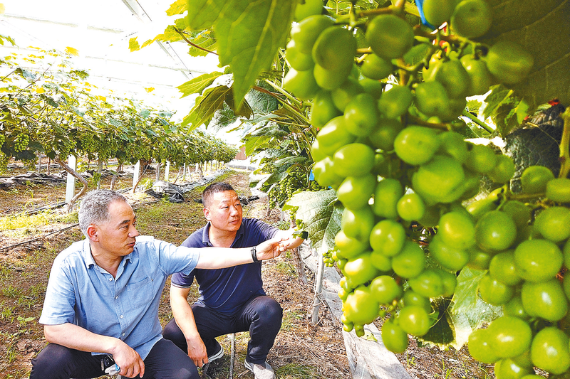 在禾绿农业开发有限公司葡萄种植园区,“阳光玫瑰”即将迎来丰收季,技术人员正在对葡萄进行修枝、疏果、病虫害防治。