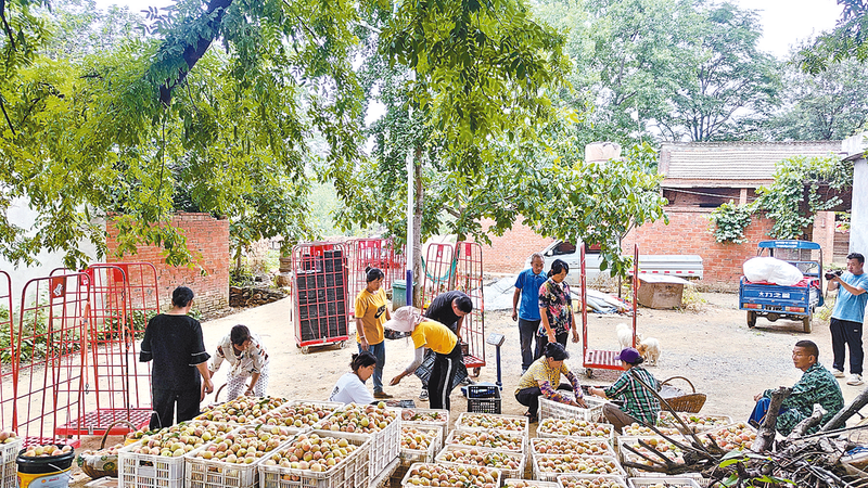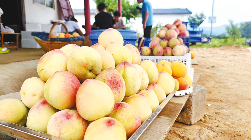 近日,泌阳县马谷田镇下河村一派繁忙景象。村民赶在雨季之前采摘成熟鲜桃,收购商等在村口,一筐筐称重后发往郑州、北京等地。