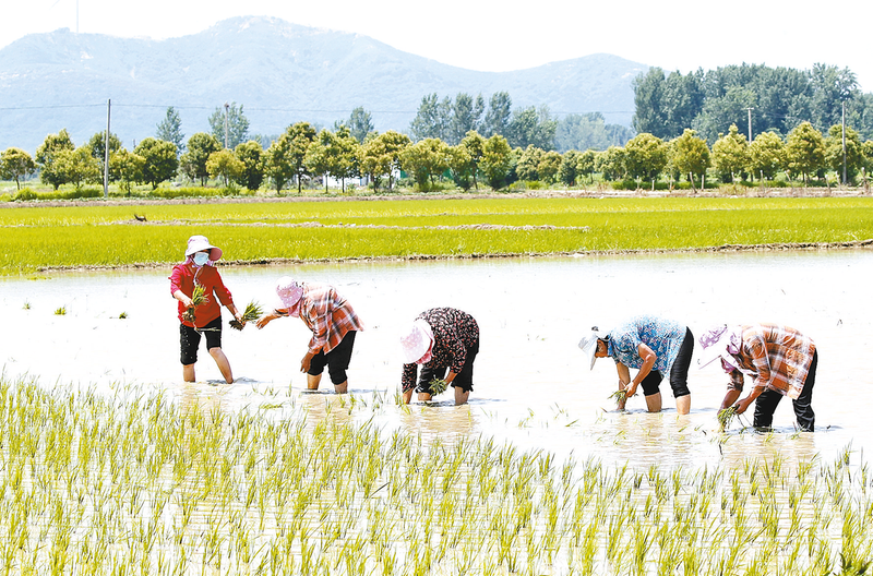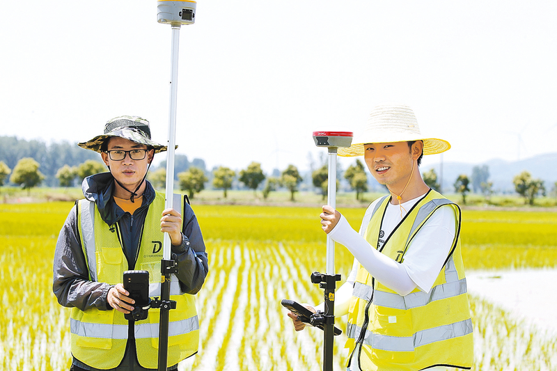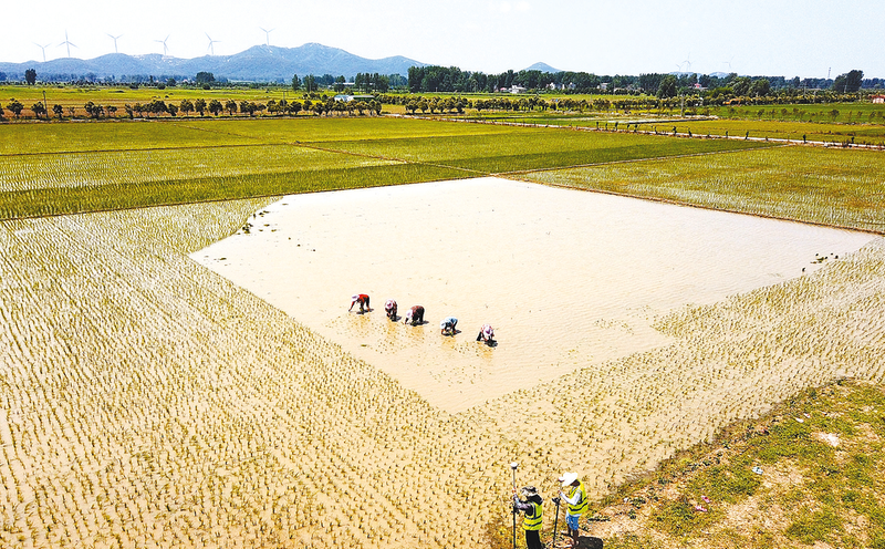 6月27日,在确山县留庄镇稻田,当地村民通过卫星精准定位进行不同色彩秧苗种植。
