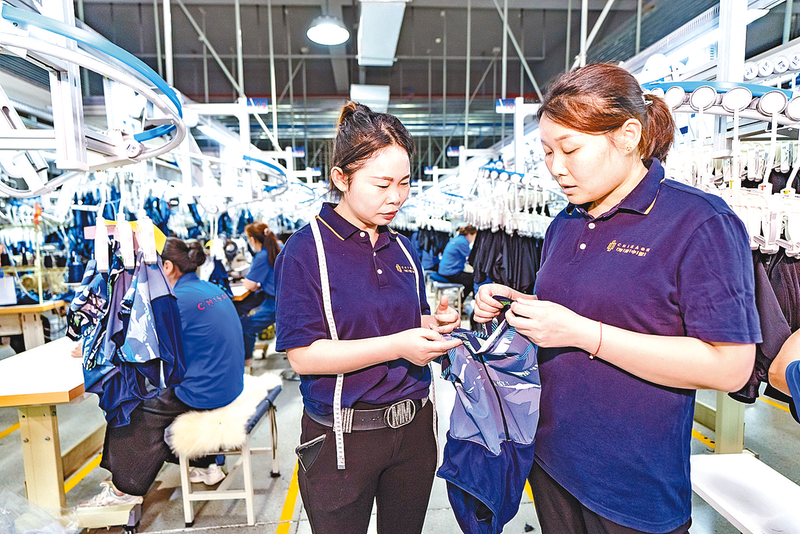 6月26日,在西平县河南中哲服饰科技有限公司,工人正在检验刚刚完工的服装。
