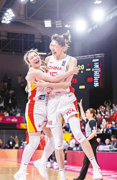 中国队球员李梦(左)和韩旭在比赛胜利后拥抱。
