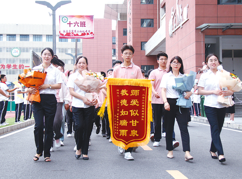 临别时刻,老师带领着学生,在学弟学妹的祝福声中,走过操场来到教学楼前再看一眼陪伴3年的二中校园。该校领导班子成员和老师伫立路边与孩子们击掌送行,对即将离开孩子们送上衷心祝福,祝愿孩子们走得更远、飞得更高。