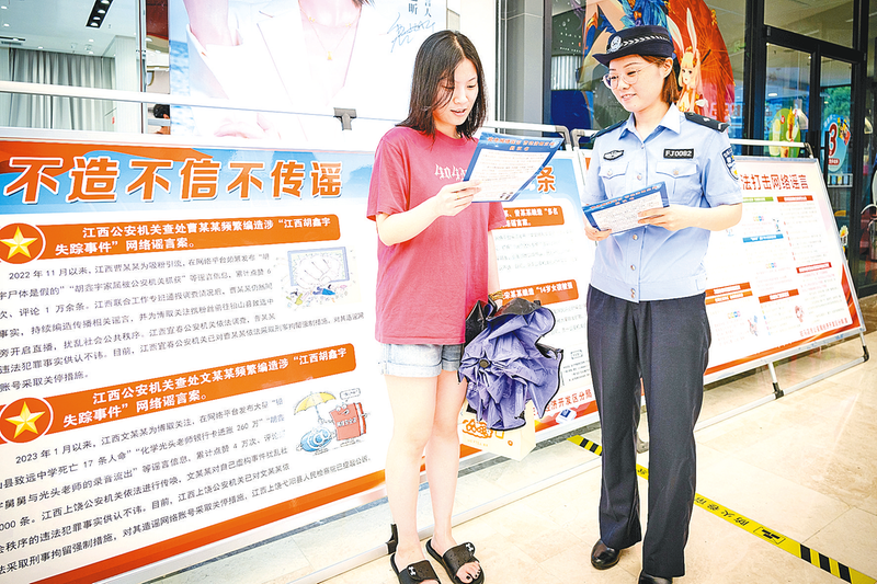 7月20日,开发区公安分局在玖隆茂购物公园、黄淮学院开展以“打击网络谣言 网警在行动”为主题的2023年打击整治网络谣言宣传周活动。