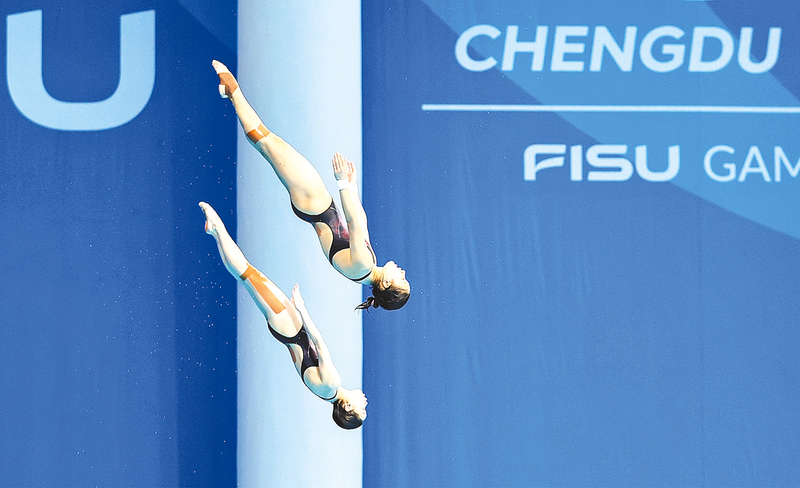女子双人10米台跳水张家齐/掌敏洁夺冠 7月31日,张家齐(下)/掌敏洁在比赛中。新华社记者 王 翔 摄
