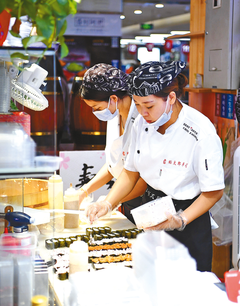 8月10日,在涿州市惠友超市钻石广场店,一家寿司店工作人员在制作寿司。目前,河北省涿州市正常生活秩序正逐步恢复。记者走访了解到,涿州市的部分商超、农贸市场已恢复正常经营,重要民生物资供应充足、价格稳定。 新华社记者 朱旭东 摄