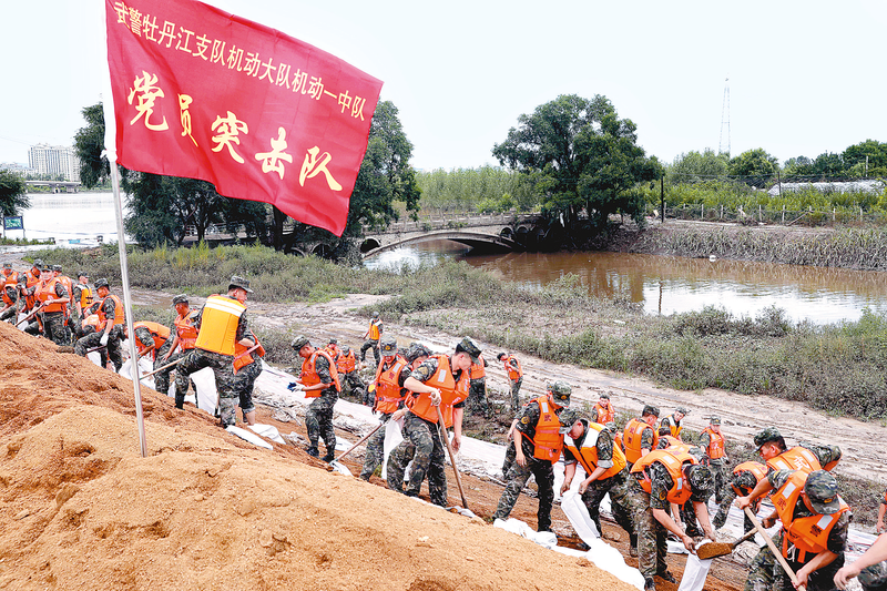 武警黑龙江总队牡丹江支队组织党员突击队对东安区东小河子堤进行加固(8月9日摄)。 新华社发