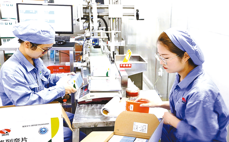天方药业有限公司加大科技投入力度,不断研发出新产品。在制剂分厂109车间里,工人正在包装药品。