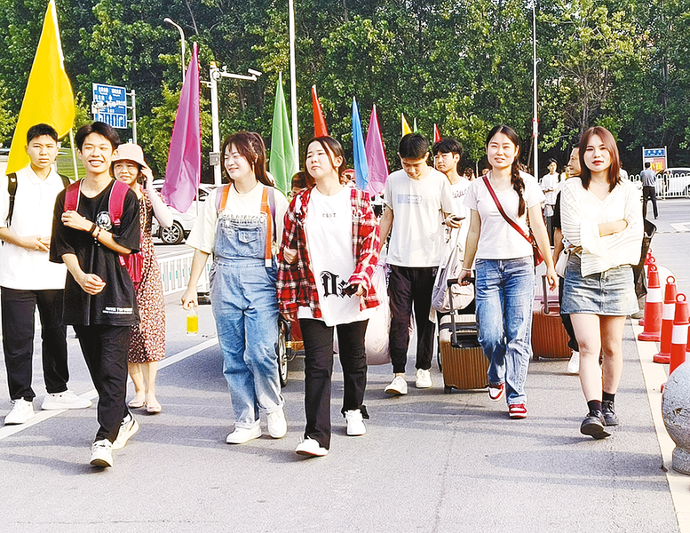 精神饱满的新生早早来到学校。