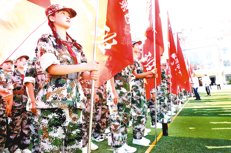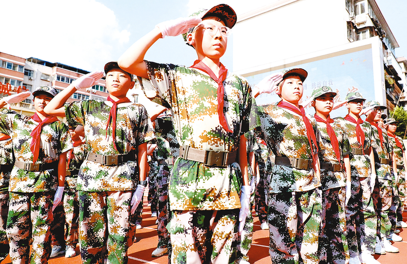 9月7日,驻马店市第四初级中学举行2023级七年级新生军训汇报表演。汇报表演在嘹亮的国歌声中拉开帷幕。