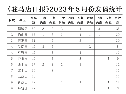 《驻马店日报》2023年8月份发稿统计