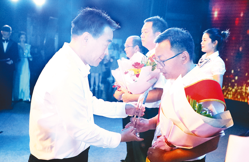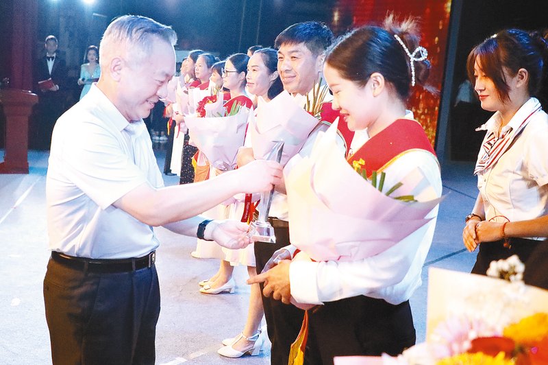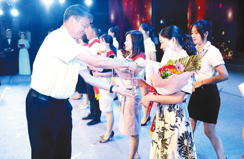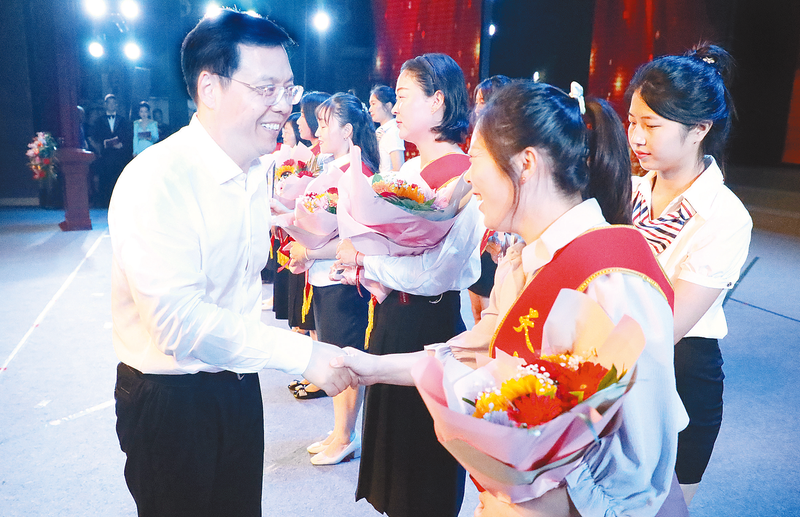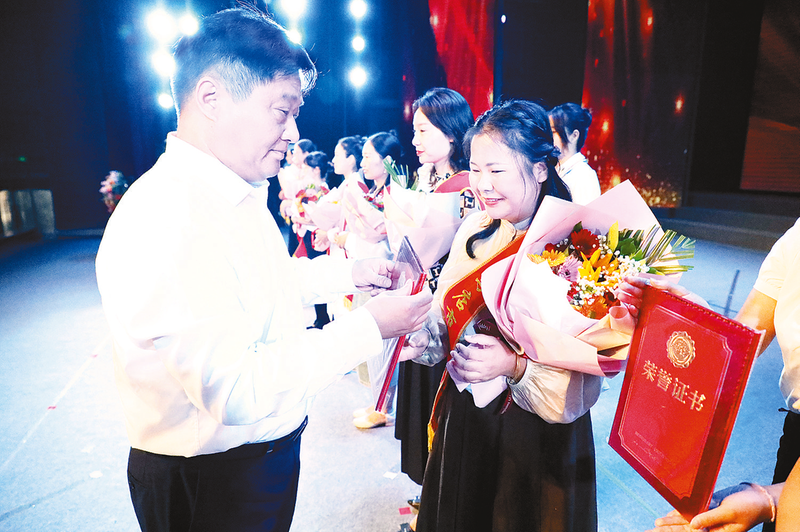 市人大常委会主任李宝清为获得天中最美教师提名奖的教师颁奖。