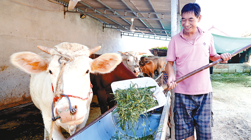 近日,在驿城区老河乡老关庄村的养牛场里,养殖户马鹏辉正在牛舍里忙碌,一头头膘肥体壮的肉牛悠闲地吃着新鲜美味的玉米秆。近年来,该村鼓励农户发展肉牛养殖业,带动农户增收致富。 本报记者 张 建 摄