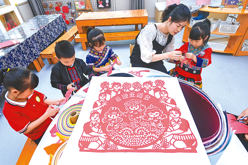 9月13日,孩子们在老师的带领下进行亚运会运动项目的主题剪纸。当日,浙江省湖州市长兴县李家巷镇中心幼儿园联合李家巷镇中心小学开展“校园剪纸迎亚运”主题活动。 新华社记者 徐 昱 摄