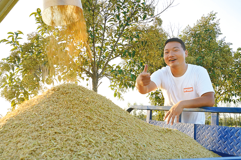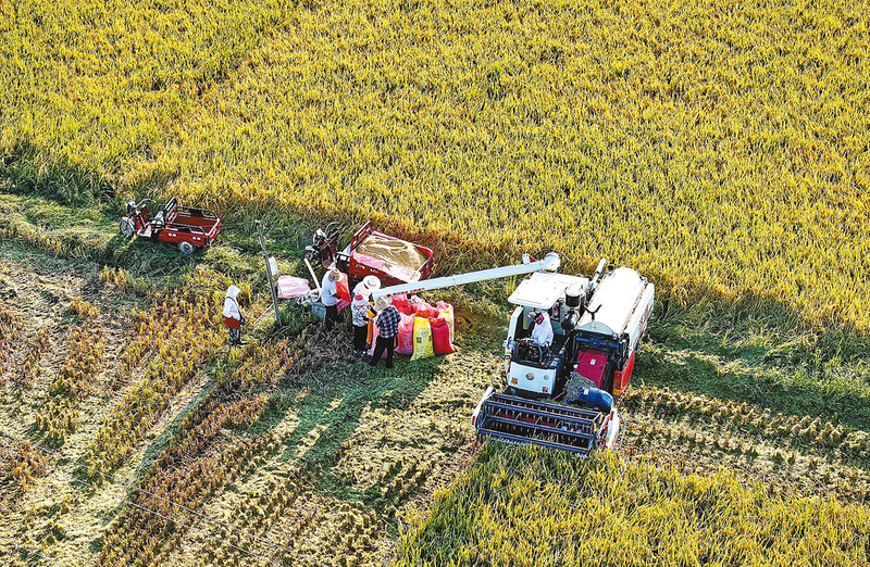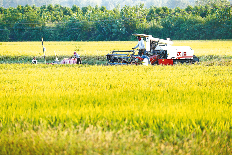 目前,正阳县紧邻淮河几个乡镇的30万亩优质水稻相继成熟,当地农民趁天抢时、抓紧收割,确保颗粒归仓。