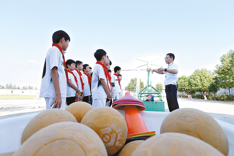 一声哨响,足球小子立刻集合。 新蔡县练村镇郑寨小学“90后”校长胡振鹏,身材瘦削、白净面孔,戴着眼镜、说话儒雅,换上运动服便立即换了个人,跳跃腾挪、精神焕发。
