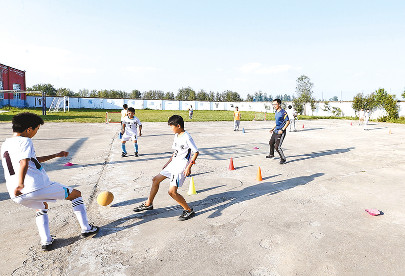 孩子们踢的黄色足球也不同于正规赛场上的黑白足球。“这是局里特批给我们的,球皮厚,耐磨。局里对我们建设足球特色学校可支持了。”胡振鹏说,“体育股说了,足球管够。”