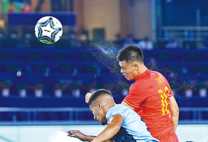 9月19日,中国队球员谭龙(右)在比赛中头球攻门。当日,在杭州亚运会男子足球小组赛A组首轮比赛中,中国队以5比1战胜印度队。 新华社记者 杜 宇 摄