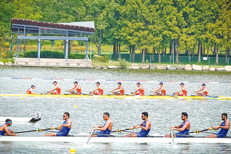 9月20日,(上左二起)中国队选手李文雷等在男子八人单桨有舵手预赛中。当日,杭州亚运会赛艇项目在浙江省杭州市富阳水上运动中心开赛。 新华社记者 江 汉 摄