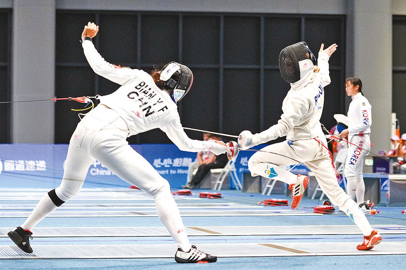 9月20日,中国选手边雨霏(左)与哈萨克斯坦选手里亚博娃在比赛中。边雨霏以265分排名第一。当日,杭州亚运会现代五项女子个人击剑大循环在浙江省杭州市富阳银湖体育中心举行。 新华社记者 薛宇舸 摄