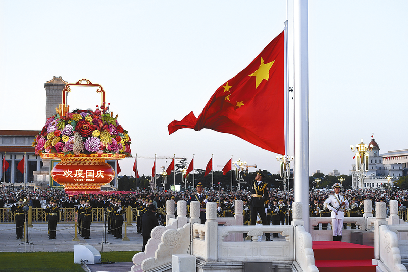 10月1日清晨,隆重的升国旗仪式在北京天安门广场举行,庆祝中华人民共和国成立74周年。当日是国庆节,各地人们用多种方式庆国庆、度假期。新华社记者 鞠焕宗 摄