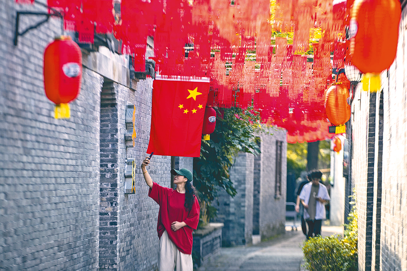 10月1日,游客在江苏省泰州市海陵区稻河古街区赏景拍照。新华社发